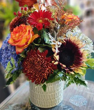 Bright Fall colors with Mums, Hydrangeas and other Autumn hued flora. Arranged in a rectangular vase..this is one of our most requested arrangements.